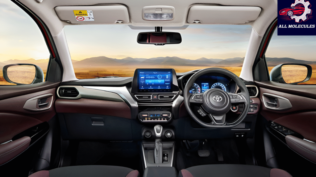 Step inside the Toyota Taisor 2025, and you’re welcomed into a cabin crafted to offer comfort and sophistication. The dual-tone interior theme adds richness, while the fabric seats and leather-wrapped steering wheel provide an inviting feel. The SUV is equipped with a 9-inch touchscreen infotainment system, wireless Android Auto and Apple CarPlay, cruise control, and automatic climate control — all designed to make every drive easier and more enjoyable.